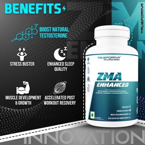 Trueforma® ZMA Enhanced is a specially crafted supplement designed to optimize recovery, sleep, and wellness. With a unique blend of Zinc Picolinate, Magnesium Glycinate, and Vitamin B6, this formula offers maximum bioavailability for improved absorption. Additionally, it includes Theanine and Valerian Root Extract to help promote relaxation and restful sleep, aiding your body’s recovery process.